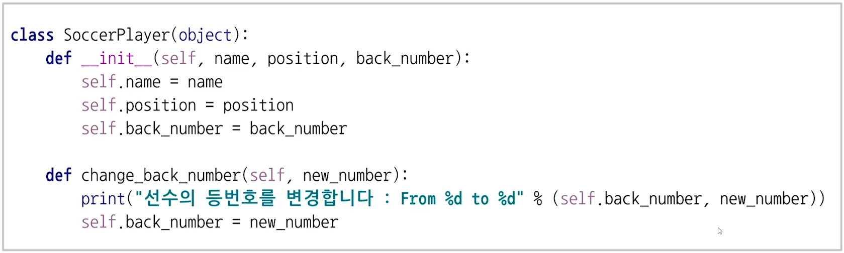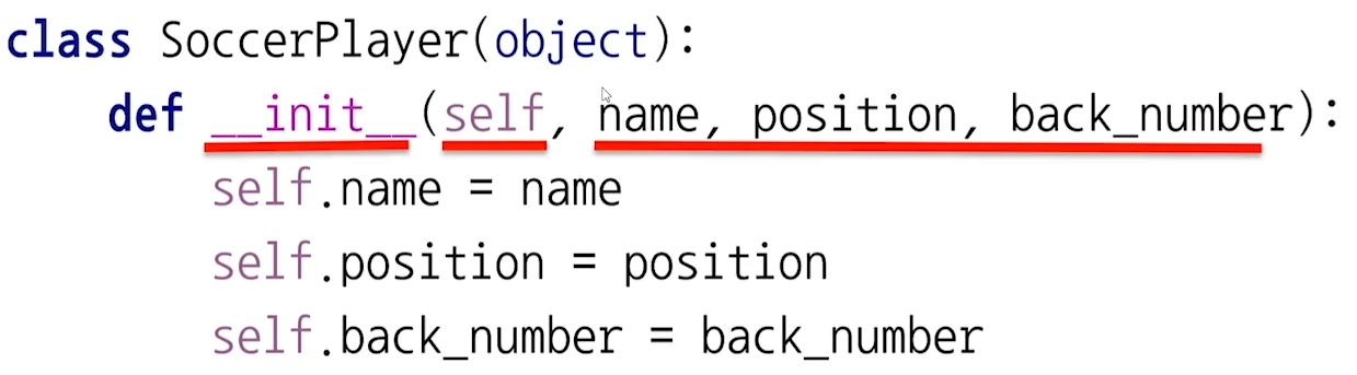 - 자기 자신을 가리킬 때 self 키워드를 사용한다.