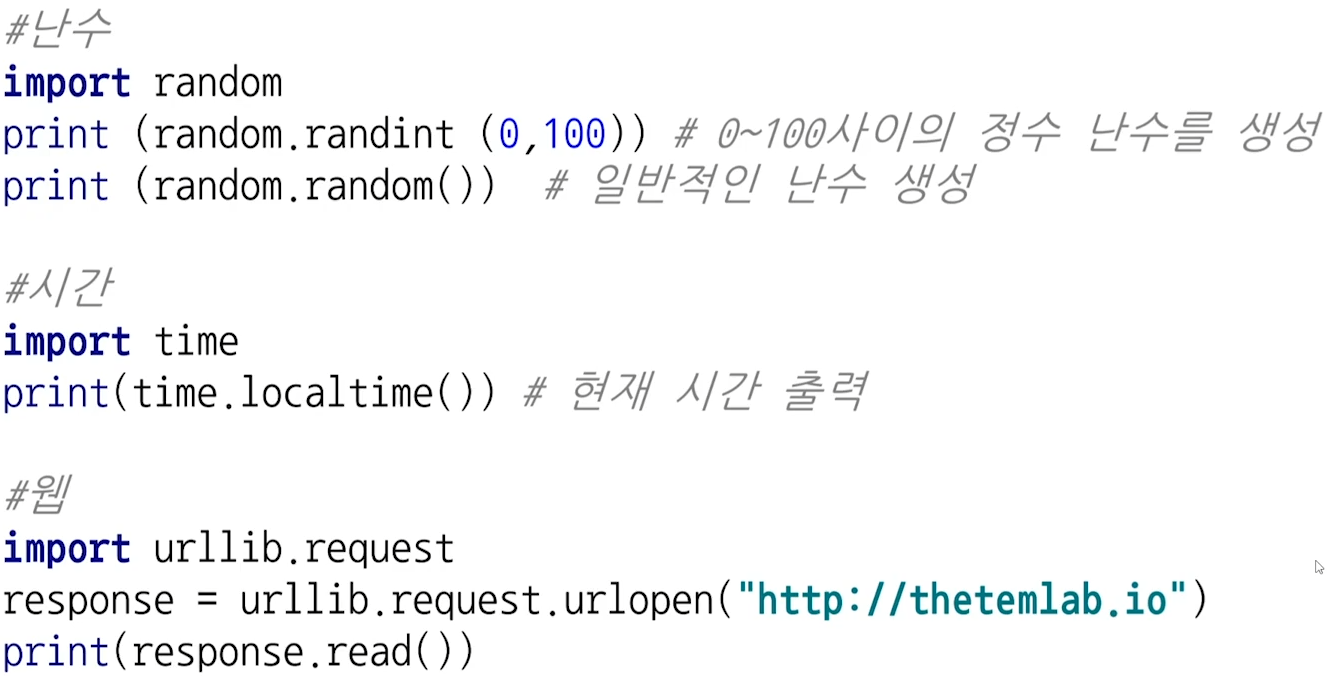 - 문자처리, 웹, 수학 등 다양한 모듈이 제공됨