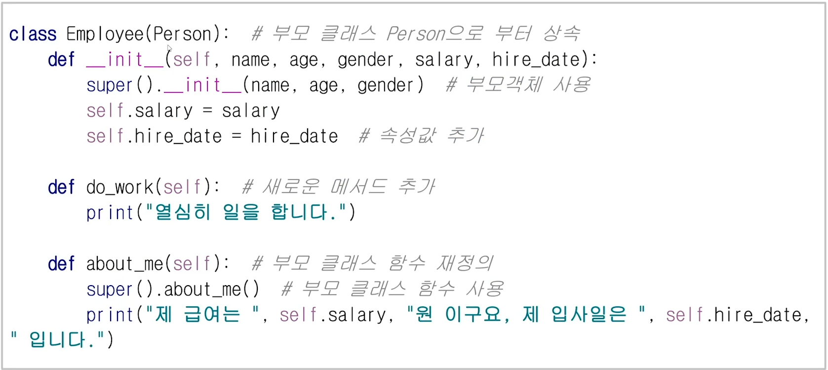 - 부모 클래스로부터 속성과 Method를 물려받은 자식 클래스를 생성하는 것